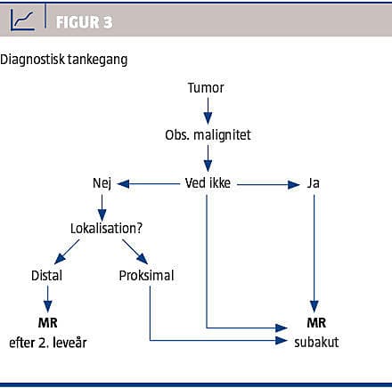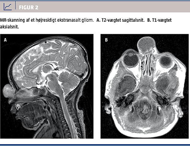 De to mest anvendte billeddiagnostiske undersøgelser i diagnosticeringen og den kirurgiske planlægning af KNMT er CT og MR-skanning. Konventionelle røntgenbilleder og knogletomografier er i dag obsolete. Det er af afgørende betydning for den videre behandling at be- eller afkræfte en intrakranial forbindelse, da en evt. kraniotomi afhænger af dette. CT giver de bedste billeder til vurdering af knogledefekter i lamina cribrosa og os frontale, hvilket kan tyde på en intrakranial forbindelse, men desværre er en knogledefekt langtfra ensbetydende med, at der er en sådan, og fundet er i forskellige studier falsk positivt hos helt op til 37% [12, 18]. MR-skanning er bedst, når man ønsker at fremstille bløddele, og giver med kontrast differentieret information om typen af det væv, tumoren består af. Dette kan allerede præoperativt give et fingerpeg om den sandsynlige diagnose. Herudover vil en persisterende intrakranial forbindelse erkendes i de fleste tilfælde. Kombineret med den manglende ioniserende stråling gør det MR-skanning til den foretrukne undersøgelse til diagnostik og præoperativ vurdering af KNMT [7, 18] (Figur 2). MR-skanning af små børn kræver generel anæstesi, og hos børn under to år er det forbundet med en øget risiko. Derfor kan man afvente skanning til efter barnets andet leveår, såfremt man kan udelukke malignitet eller encefalocele. Er tumoren sikkert til stede fra fødslen, kan malignitet udelukkes, og er den lokaliseret distalt for ossa nasales, er det ikke et encefalocele. Ved proksimal lokalisation eller tvivl bør barnet skannes tidligere (Figur 3).