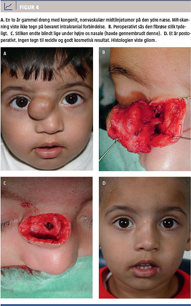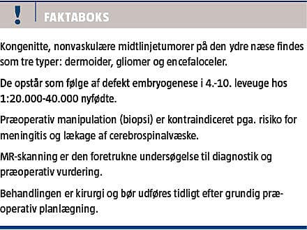 Kongenitte, nonvaskulære midtlinjetumorer (KNMT) på den ydre næse er sjældne og forekommer, afhængigt af typen, hos 1:20.000-40.000 nyfødte [1]. Der findes tre typer nævnt efter hyppighed: dermoider, gliomer og encefaloceler. De er benigne, men kan forårsage svær deformitet af midtansigtet, destruktion og blivende påvirkning af næsens strukturer, recidiverende infektioner og meningitis. De opdages oftest umiddelbart efter fødslen, men små KNMT diagnosticeres af og til senere. Til trods for at kun disse tumorer er medfødte, fejldiagnosticeres de ikke sjældent med deraf følgende risiko for fejlbehandling og komplikationer [2].