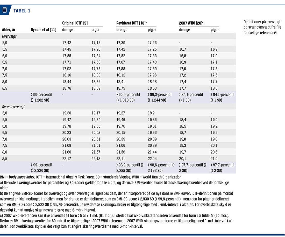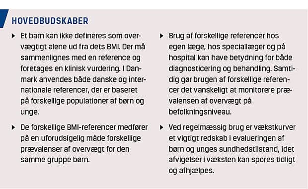 Med den udbredte brug af body mass index (BMI = kg/m2) til vurdering af overvægt hos voksne er der også udviklet BMI-referencer for børn og unge. Desværre er der ikke konsensus om, hvilken reference der skal benyttes, selvom det i 2007 blev anbefalet at bruge ens vækstkurver for børn i Danmark [2]. I praksis anvendes der således flere forskellige nationale og internationale referencer til klassificering af overvægt og svær overvægt hos børn. Da referencepopulationerne og de dertil hørende skæringsværdier er forskellige, vil opgørelser af prævalenser og klassifikationen af den enkelte også blive forskellig, alt efter hvilken reference der anvendes.