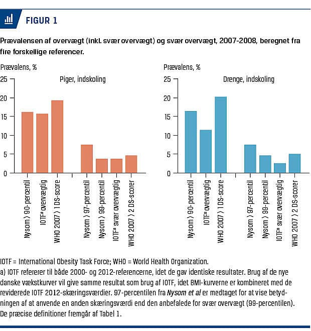 For at illustrere de forskellige resultater ved brug af de enkelte referencer har vi på tidligere offentliggjorte data fra København fra skoleåret 2007/2008 [21] lavet beregninger med fire referencer: 1) Nysom et al [11], 2) den oprindelige IOTF-reference [5], 3) den reviderede IOTF-reference [18] og 4) 2007 WHO-vækstrefe-rencen [20]. Som nævnt har Tinggaard et al [12] inkorporeret den reviderede IOTF-reference, og det er derfor ikke muligt at beregne prævalensen baseret på de data, der ligger til grund for de nye danske kurver.