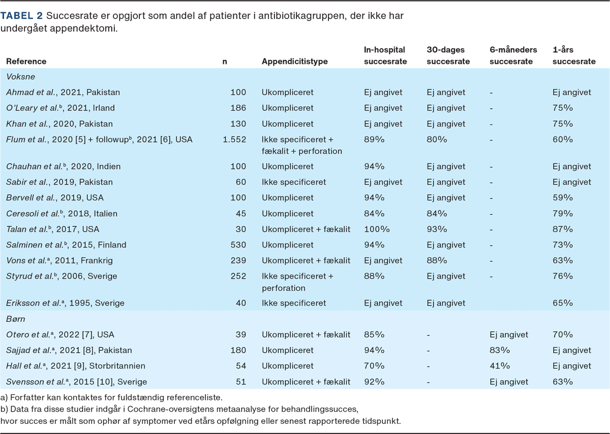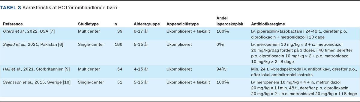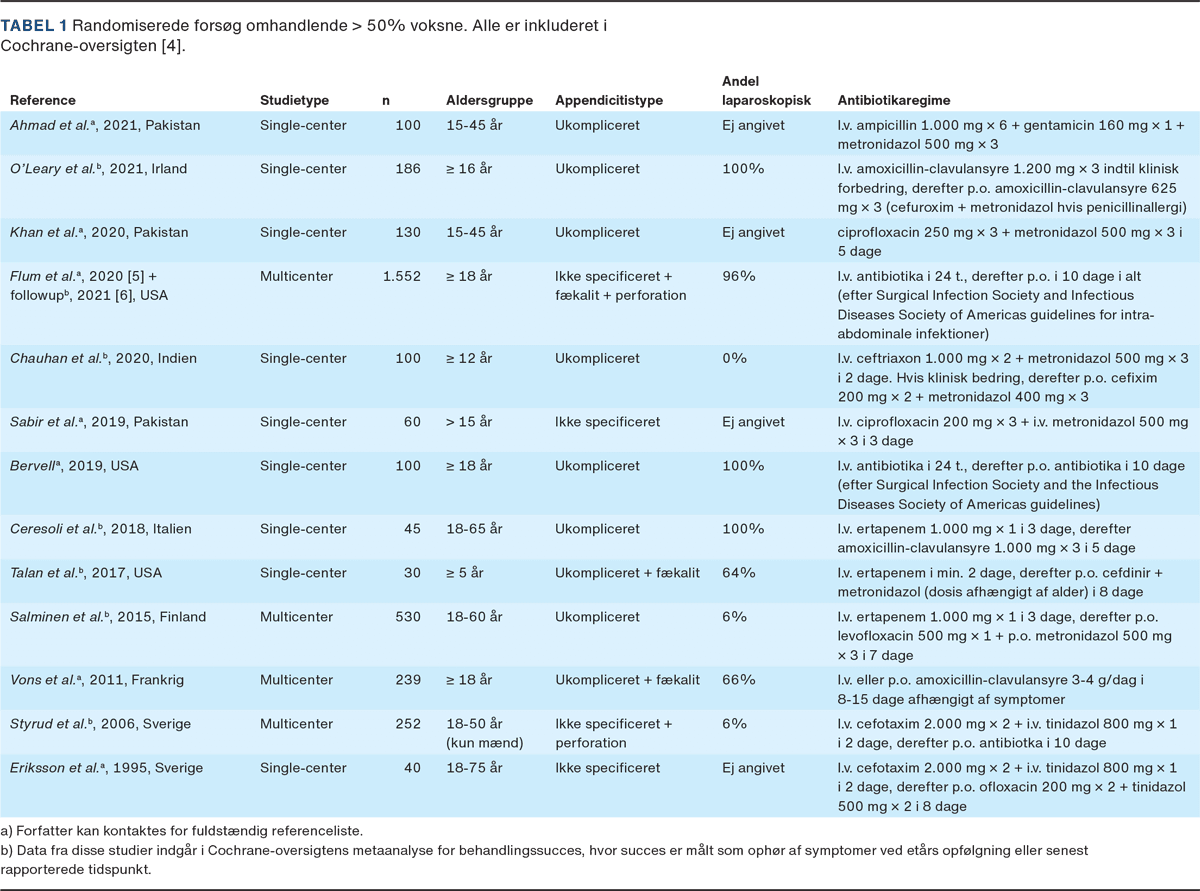 I en statusartikel i Ugeskrift for Læger fra 2014 [16] blev det konkluderet, at der ikke var nok studier af god nok kvalitet til at afgøre, om antibiotikabehandling kan være et alternativ til operation. Siden da er udgivet mere end 10 RCT’er (Tabel 1, Tabel 2).