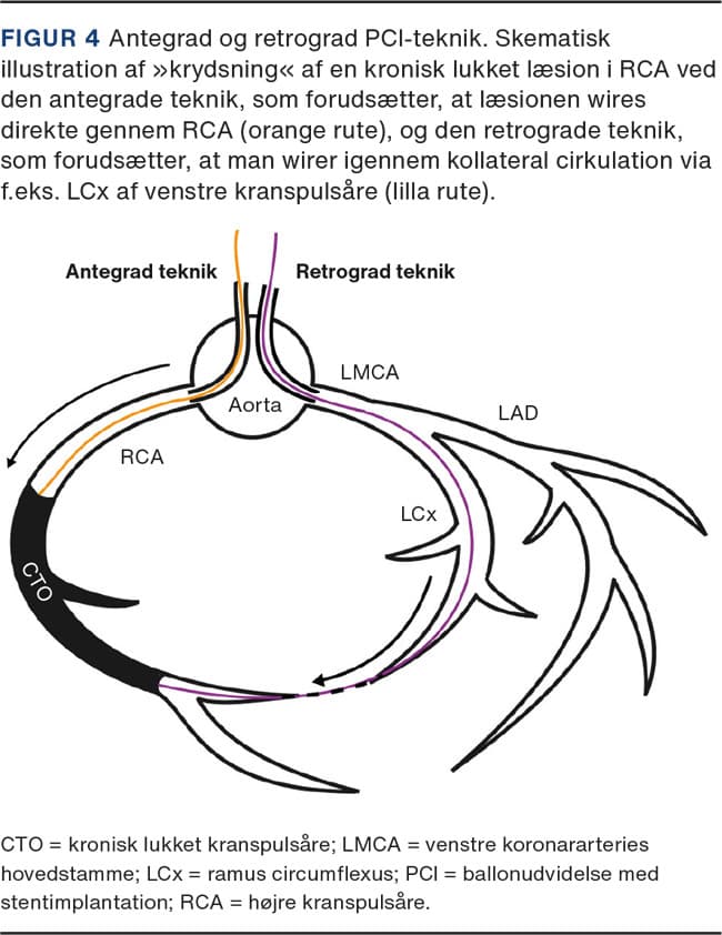 Hvis det bliver besluttet at tilbyde PCI, er det vigtigt at optimere rammerne for at sikre et succesfuldt resultat. I Danmark foretages der fordelt på seks PCI-centre årligt PCI hos 300-400 patienter med CTO. Det er vigtigt at samle procedurerne på få hænder, da man har påvist en stor forbedring i succesrate efter de første 40-60 cases [6]. Man har også vist, at succes- og komplikationsraten for operatører med sparsom erfaring forbedres, hvis de er på et center med en høj volumen [22]. Ved PCI-behandlingen er det vigtigt, at man behersker forskellige teknikker for at optimere succesraten i komplekse CTO-læsioner [23]. Man skal være i stand til: 1) at udføre dobbeltkontrastinjektion (Figur 1), 2) tolkning og udførelse af intrakoronar UL-skanning samt at udføre 3) antegrade teknikker, 4) retrograde teknikker og 5) teknikker, som dissekerer kranspulsårens lamina intima. Den antegrade teknik minder om den, som benyttes ved konventionel PCI-behandling, og er defineret ved, at man fører en ledetråd proksimalt til distalt i den kranspulsåre, som behandles. Forskellen ved CTO-behandling er, at fremrykning af wiren støttes af mikrokatetre og kræver høj teknisk ekspertise. Ved den retrograde teknik fører man en ledetråd fra en af de andre kranspulsårer igennem en kollateral anastomose til den distale ende af CTO-læsionen for herefter at passere læsionen proksimalt (Figur 4). I RECHARGE-registreret afprøvede man en hybridalgoritme, som startede med den mindst risikofyldte strategi (antegrad), og efterfølgende opeskalerede man til den retrograde strategi. Ved anvendelse af hybridalgoritmen observerede man en meget høj succesrate på 88% og en lav komplikationsrate [5]. Hvis man anvender andre strategier end den antegrade, er proceduren defineret som en kompleks CTO-behandling med høj risiko for komplikationer. Disse må ifølge Sundhedsstyrelsens visitationsretningslinjer kun udføres på centre med thoraxkirurgisk assistance og niveau 3-intensiv afdeling (dvs. Aalborg, Aarhus, Odense og Rigshospitalet). Lavrisikoprocedurer, hvor man anvender den antegrade teknik i en selekteret patientgruppe, udføres i Roskilde og Gentofte. Risikoen for alvorlig komplikation (død, akut bypassoperation, akut myokardieinfarkt eller stroke) er 3,1% (95% konfidens-interval: 2,4-3,7). Risikoen er primært drevet af procedurerelaterede myokardieinfarkter, som man ikke kender den prognostiske værdi af [24]. Risikoen for komplikation er 2,0% hos en samlet PCI-population [25]. Man har ikke lavet undersøgelser, hvor man sammenligner komplikationsrater hos de to grupper.
