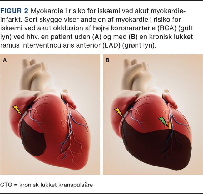 Det anbefales at revaskularisere medicinsk behandlede symptomatiske patienter, som har CTO, og som ikke opfylder kriterierne for prognostisk behandling [11]. Dette blev undersøgt i EURO-CTO-studiet, hvor 396 patienter blev randomiseret til PCI eller OMT. Man fandt en statistisk signifikant forbedring i symptombyrde og livskvalitet i PCI-gruppen [12]. I det eneste prospektive randomiserede studie, som var designet til at vise en statistisk forbedring på det kombinerede effektmål: død, akut myokardieinfarkt, stroke eller fornyet revaskularisering, fandt man ingen forskel mellem grupperne [13]. Dette skyldes muligvis, at studiet blev stoppet før tid pga. lav inklusionsrate, og en stor overkrydsning mellem grupperne. I »as-treated«-analysen fandt man en forbedring af prognosen hos patienter, som havde CTO og først fik OMT og derefter PCI sammenlignet med prognosen hos patienter, som udelukkende havde fået OMT. I et andet randomiseret studie fandt man en reduktion i myokardiel iskæmi ved PCI-behandling sammenlignet med OMT. Dette støttes op af andre prospektive undersøgelser [14-17]. Man har ligeledes observeret, at risikoen for at få stød af en ICD-enhed implanteret på sekundær profylaktisk baggrund er større hos patienter med CTO, end hos patienter med koronar aterosklerose uden CTO [18]. Ovenstående ligger til grund for, at behandling med PCI anbefales med en IIa-anbefaling i guidelines. Dvs. at revaskularisering bør overvejes, men at der er ikke tilstrækkelig evidens til at anbefale det [11]. Prognosen hos patienter med CTO bliver aktuelt undersøgt i ISCHEMIA-CTO-studiet (NCT03563417 udgående fra AUH), hvor 1.560 patienter randomiseres til OMT eller OMT + PCI. Hypotesen ved revaskularisering er bl.a., at den del af myokardiet, som er i risiko for at få iskæmi ved en akut blodprop i en af de andre kranspulsårer, er større, når man har CTO (Figur 2). Man vil desuden forvente, at risikoen for at udvikle symptomgivende CTO og iskæmisk betinget hjertesvigt er lavere.
