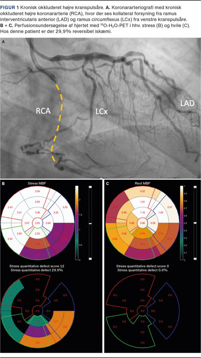 Hvert år diagnosticeres der i Danmark ca. 17.000 patienter med iskæmisk hjertesygdom. Halvdelen debuterer med en blodprop i kranspulsårerne, og den anden halvdel debuterer med symptomer som f.eks. anstrengelsesudløste brystsmerter og/eller åndenød (kronisk koronart syndrom (KKS)) [1]. Invasiv diagnostik med koronararteriografi (KAG) viser, at 15% af patienterne har en kronisk lukket kranspulsåre (chronic total occlusion (CTO)) [1, 2]. CTO er defineret som en total aflukning af kranspulsåren i mere end tre mdr. (Figur 1). Ofte vil man opbygge blodforsyning med fysiologiske kollaterale anastomoser, som holder hjertemuskulaturen perfunderet i hvile. Ved belastning vil anastomoserne ikke være i stand til at opretholde tilstrækkelig perfusion, og derfor kan der opstå myokardiel iskæmi. Patienter med CTO har en højere langtidsdødelighed end patienter, som ikke har CTO [2]. Dette kan skyldes, at patienter med CTO har større komorbiditet og kompleksitet af åreforkalkning i kranspulsårerne [3, 4]. Ved invasiv behandling af patienter med CTO er der en lidt højere risiko for procedurerelaterede komplikationer og en betydelig lavere sandsynlighed for succesfuld behandling ved ballonudvidelse med stentimplantation (PCI) end ved behandling af simple kranspulsåreforsnævringer. På centre med et stort volumen af CTO-procedurer, hvor man anvender moderne teknikker, er sandsynligheden for succesfuld behandling 85-90%. Dette står i stor kontrast til centre med lav ekspertise og volumen, hvor succesraten er 45-55% [5, 6].