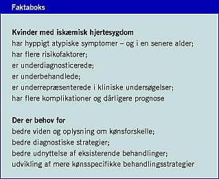 Ved iskæmisk hjertesygdom er der vigtige kønsforskelle i fremtræden, diagnostik og behandling, som kræver særlig opmærksomhed. Resultaterne af mange undersøgelser tyder på, at kvinder med både akutte og kroniske symptomer på isk-æmisk hjertesygdom er underdiagnosticerede og underbehandlede sammenlignet med mænd. Ved manifest iskæmisk hjertesygdom udnyttes rekommanderede invasive, medicinske og profylaktiske behandlinger i ringere grad hos kvinder, og kvinders generelle underrepræsentation i kliniske undersøgelser har begrænset vor viden om den optimale behandling.