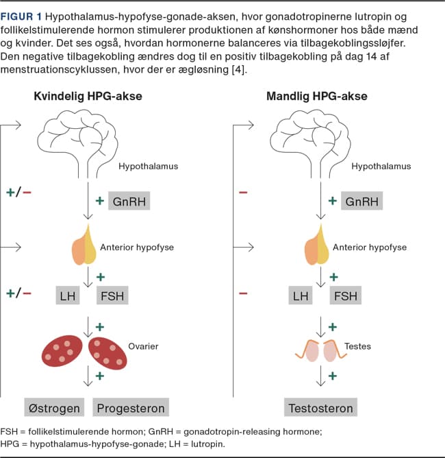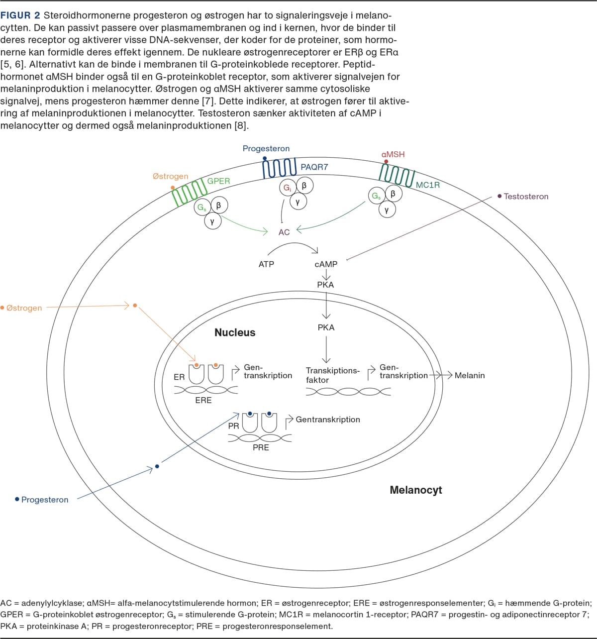Produktionen af henholdsvis kvindelige og mandlige kønshormoner er illustreret i Figur 1 [4]. Østrogen, progesteron og testosteron er steroidhormoner, som har en virkning i melanocytter. Østrogen og progesteron har to intracellulære signaleringsveje. De kan binde til en nuklear receptor og til plasmamembranbundne G-proteinkoblede receptorer, mens testosteron har en mere direkte virkning på aktiviteten af cAMP [5-8]. Figur 2 illustrerer de forskellige intracellulære signaleringsveje for østrogen, progesteron, testosteron og alfa-melanocytstimulerende hormon i melanocytter. Huden på ansigtet har en høj koncentration af nukleare østrogenreceptorer, hvilket kan være en medvirkende faktor til, at melasma oftest opstår i ansigtet [9].