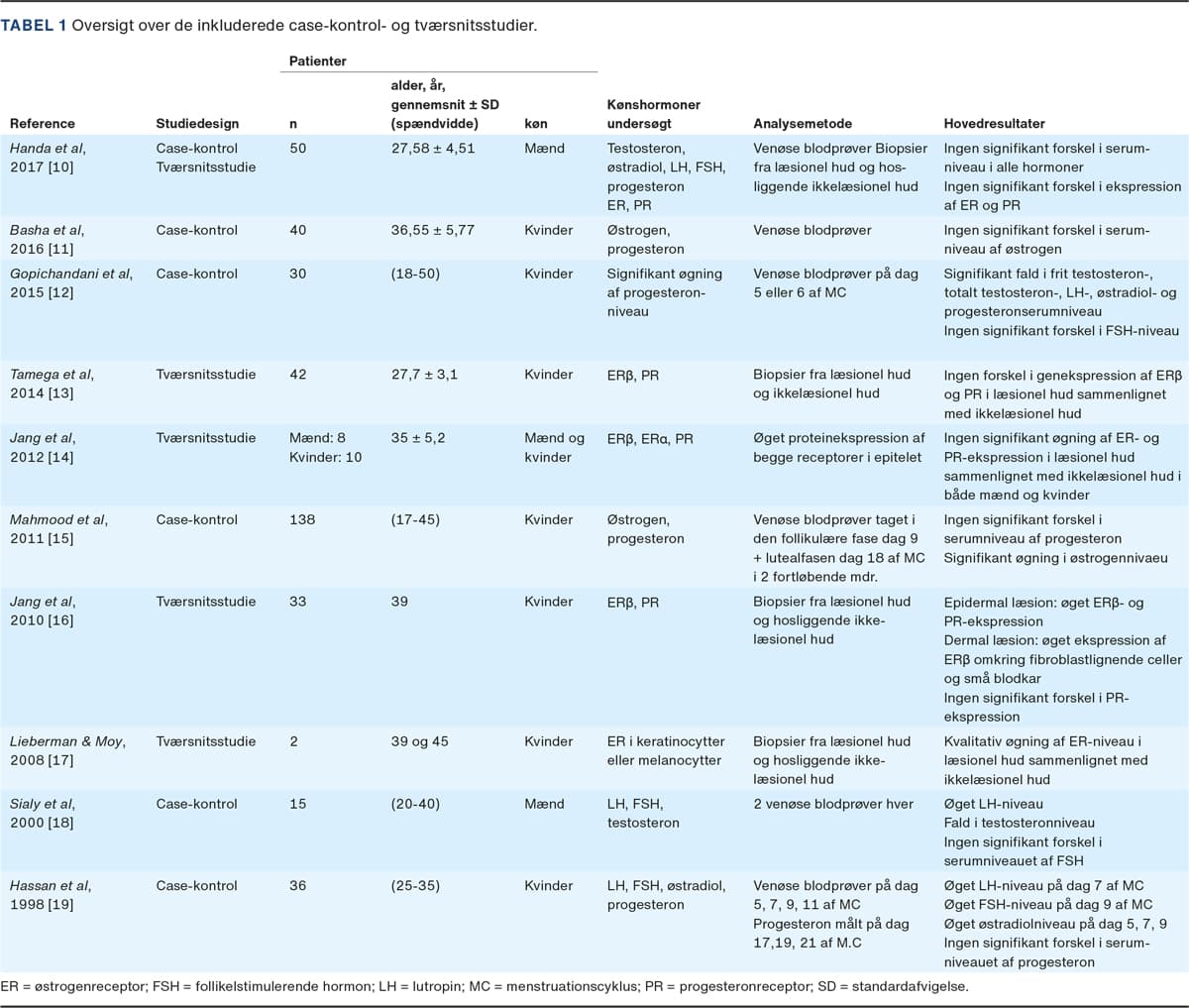 Der er ved hjælp af en systematisk søgning fundet ti studier, som har undersøgt forskellige kønshormoner og deres rolle i patogenesen af melasma. Seks af studierne er case-kontrol-studier, og fem er tværsnitsstudier. Alle resultater fra studierne er opsummeret i Tabel 1.
