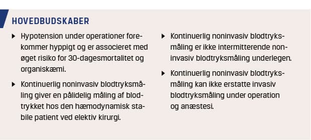 Kontinuerlig NIBP-måling synes at være tilfredsstillende nøjagtig under vedligehold af anæstesi ved den hæmodynamisk stabile patient sammenlignet med IAP-måling [11, 12, 15]. Et problem, der ses ved sammenligning med både IAP- [12] og NIBP-måling [18], er, at nøjagtigheden svinder ved ændring i den vasomotoriske tonus som under induktionen eller ved hypotension [12, 18]. Ved hypotension underestimeres BT-faldets størrelse ved kontinuerlig NIBP-måling, hvilket bør tages med i overvejelserne, hvis der ønskes at intervenere ved dette [12].