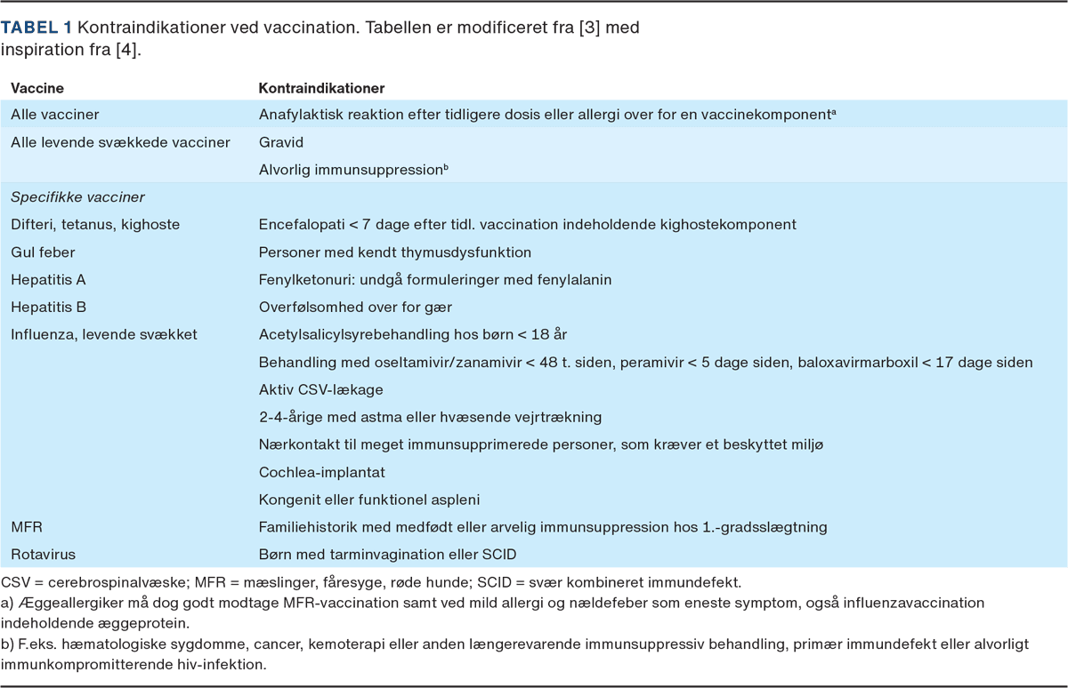 Overordnet set, er der relativt få medicinske årsager til at udskyde eller fraråde vaccinationer. For alle vacciner gælder, at de er kontraindicerede, hvis personen tidligere har oplevet en anafylaktisk reaktion grundet vaccinen eller en vaccinekomponent. Hos patienter med alvorlig immunsuppression medfører de levende, svækkede vacciner en øget risiko for vaccinederiverede infektioner. Selv om de immunsupprimerede patienter ofte også er i øget risiko for alvorlige sygdomsforløb, hvis de bliver inficerede med den pågældende virus eller bakterie, vurderer man i de fleste situationer, at risikoen med levende vacciner er for stor, og derfor frarådes de generelt i disse patientgrupper. Levende, svækkede vacciner er også kontraindicerede hos gravide kvinder grundet den teoretiske risiko for, at virus krydser placenta og inficerer fosteret. De kan dog gives i sjældne tilfælde, hvor risikoen for smitte er stor, og hvor fordelene ved at vaccinere er større end de potentielle risici for fosteret. Desuden anbefales et minimumsinterval på fire uger mellem forskellige levende vacciner, medmindre de administreres samtidig for at nedsætte risikoen for reduceret vaccinerespons [2]. Ud over det findes der flere vaccinespecifikke kontraindikationer (Tabel 1).