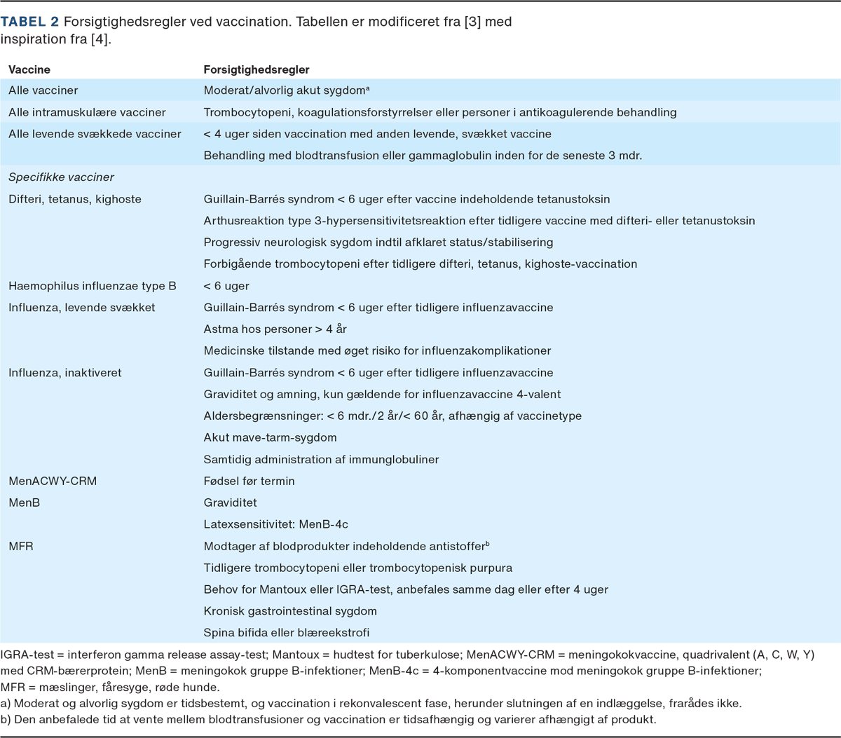 Forsigtighedsregler inkluderer situationer med risiko for nedsat vaccinerespons, eller hvor bivirkninger kan skabe diagnostisk forvirring, f.eks. i tilfælde af moderat til alvorlig akut infektion med høj feber, hvor det er svært at skelne mellem infektion og eventuelle bivirkninger, og der er risiko for intensiverede sygdomssymptomer (Tabel 2) [3-5]. Der foreligger dog ikke evidens for nedsat immunogenicitet eller øget bivirkningsprofil efter vaccination ved samtidig mild infektion med lav feber, og vaccination bør derfor ikke frarådes i disse tilfælde [6]. Det samme gælder samtidig brug af antibiotika, der ikke nødvendigvis skal betyde udskudt vaccination fraset f.eks. ved den orale tyfusvaccination, hvor antibiotika kan hæmme svækkede bakterier i vaccinen og derved nedsætte vaccineresponsen [3, 4].