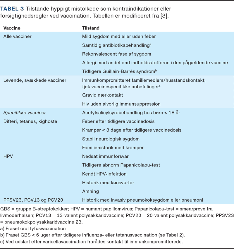 Fejltolkede kontraindikationer og forsigtighedsregler med unødvendigt udskudte eller frarådede vaccinationer kan medføre øget risiko for infektioner, smittespredning og nedsat vaccinedækning. I et studie blandt europæiske pædiatere og spørgsmål omkring vaccination i forskellige kliniske situationer fandt man, at hver femte vaccine enten blev fejlagtigt udskudt eller frarådet, og 75% af deltagerne ville udskyde vaccination, hvis et spædbarn havde lav feber (38,0 °C) uden andre symptomer, og 38% ville udskyde vaccination på baggrund af igangværende antibiotikabehandling [7]. Ud over mild infektion, lav feber og samtidig antibiotikabehandling findes der mange tilstande, som fejlagtigt bliver mistolket som værende kontraindikationer [3, 5]. En tilstand, som hyppigt bliver tolket som årsag til at udskyde vaccination, er nylig sygdom. Der findes dog ikke videnskabelige belæg for, at man skal udskyde vacciner i en rekonvalescensfase. Tværtimod viser flere større studier, at influenzavaccination under hospitalsindlæggelse er sikkert og ikke associeret med nedsat vaccineeffekt, feber eller behov for klinisk vurdering [8, 9] (Tabel 3).