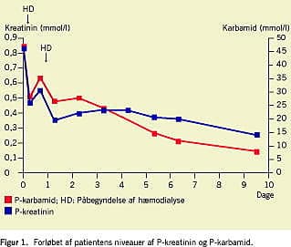 Pga. P-kreatinin på 0,207 mmol/l målt hos egen læge var patienten blevet henvist til billeddiagnostik. Der blev udført intravenøs (i.v.) urografi og ultralyd. Desværre blev P-kreatinin ikke målt umiddelbart før proceduren, ligesom metformin heller ikke blev seponeret. Efterfølgende ophørte patientens urinproduktion, og han fik kvalme med ublodige opkastninger uden febrilia eller smerter. På tredje døgn efter i.v.-urografien målte egen læge P-kreatinin til 0,8 mmol/l og P-kalium til 7,7 mmol/l. Ved indlæggelsen var patienten akut påvirket med taledyspnø og moderate ankelødemer. Hans P-kreatinin var da på 0,848 mmol/l, P-karbamid 46,4 mmol/l, P-kalium 7,4 mmol/l og bicarbonat 11,4 mmol/l, hvilket indikerer uræmi med metabolisk acidose. Desværre foreligger der ikke svar på A-punktur. International normalized ratio (INR) var på 5,2, og P-digoxin var på 3,46 mmol/l, hvilket tyder på akut forværring i nyrefunktionen. Patienten blev hæmodialyseret akut grundet hyperkaliæmi og svær acidose (Figur 1 ). I løbet af de følgende timer kom diuresen i gang, hvorefter rehydrering og behandling med furosemid blev påbegyndt. Efter endnu en hæmodialyse restitueredes nyrefunktionen, og patienten kunne udskrives efter seks dages indlæggelse. Det oplystes efterfølgende, at resultatet af i.v.-urografien gav mistanke om nefropati.