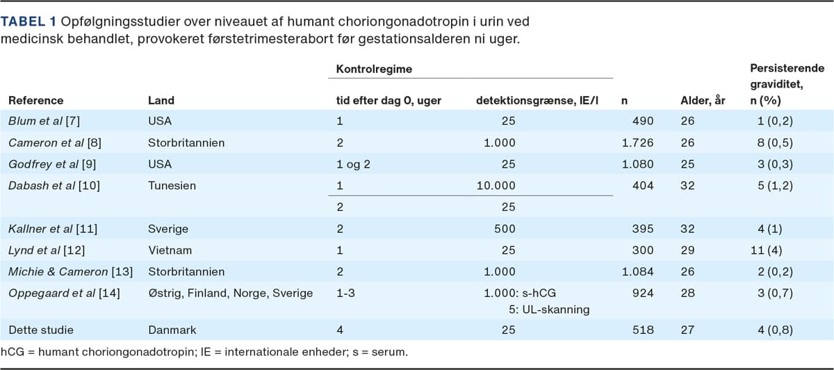 Gennemsnitsalderen i vores opgørelse var 26 år, hvilket svarer til populationerne i andre studier (Tabel 1). Vi brugte måling af u-hCG-niveauet fire uger efter administration af medicin, hvor man i de fleste andre studier har brugt måling af u-hCG-niveauet 1-2 uger efter medicinadministration. I disse studier har man tilsvarende brugt måling af u-hCG-niveauet med en nedre detektionsgrænse på > 1.000 IE/l, hvilket er passende, når opfølgningen finder sted kortere tid efter medicinadministration.