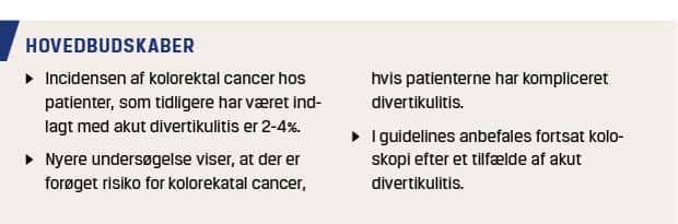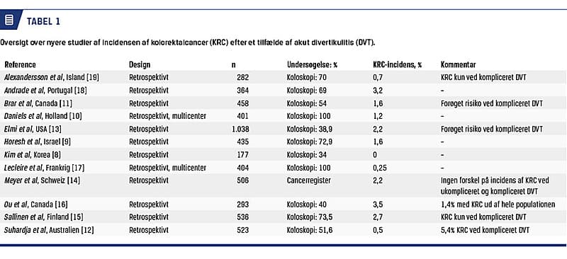 I europæiske og amerikanske guidelines anbefales koloskopi efter CT-verificeret divertikulitis i rolig fase for at udelukke kolorektal cancer (KRC) [6, 7]. I de danske nationale guidelines fra 2012 anbefales i tråd hermed koloskopi efter divertikulitis [1]. Kontrolkoloskopi efter divertikulitis er indført baseret på ekspertvurderinger og har begrænset evidens. I en række nyere studier belyses incidensen af KRC efter CT-verificeret divertikulitis. I studierne er der fundet lav incidens
