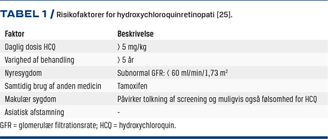 Risikofaktorer for udvikling af øjenskader er illustreret i Tabel 1. Da HCQ udskilles gennem nyrerne, anbefales et forsigtighedsprincip ved påvirket nyrefunktion med estimeret glomerulær filtrationsrate < 60 ml/min, også selvom der ikke er videnskabelige undersøgelser til at understøtte specifikke rekommandationer. Det er velbeskrevet, at der er racemæssige forskelle i HCQ’s påvirkning af retina, og særligt den asiatiske befolkning får forandringer, der adskiller sig fra andres og ofte først ses, når der er sket signifikant skade [29]. Derfor må der ofte foretages hyppigere øjenkontroller hos asiater.