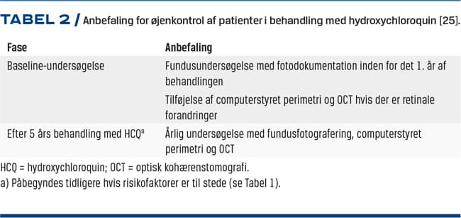 På baggrund af ovenstående, har man ændret anbefalingerne for kontrol af patienter, der er i behandling med HCQ (Tabel 2).