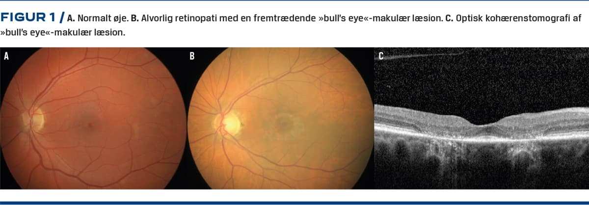 Det kliniske billede af HCQ-øjenskade er karakteristisk beskrevet som den klassiske bilaterale »bull’s eye«-makulopati (Figur 1). Betegnelsen henviser til en ringformet perifoveal depigmentering af nethinden med et normalt udseende retinarelief centralt i ringen. Dette lærebogsmønster burde ikke længere ses, da man med de anbefalede undersøgelsesmetoder kan detektere HCQ-skaderne, længe før de bliver synlige som morfologiske forandringer i nethinden.