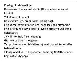 Af hensyn til langtidsbivirkningerne reserveres KS på de nævnte indikationer som hovedregel til avancerede sygdomsstadier med en forventet levetid på få måneder. Der kan opnås god, i nogle tilfælde dramatisk effekt. Den holder sig i 4-6 uger; herefter vil der være aftagende effekt [13, 20], formentlig forårsaget af sygdomsprogression. Der foreligger ingen evidensbaseret optimal dosering, men det fremhæves, at initialdosis bør være tilstrækkelig høj til, at en effekt er tydelig efter en uge [3, 9, 20, 39]. Såfremt der ikke er effekt efter en uge, seponeres behandlingen uden aftrapning [10, 39, 40], ellers nedtrappes gradvis til laveste effektive vedligeholdelsesdosis [20]. Der ses ofte symptomforværring ved for hurtig aftrapning og seponering, f.eks. efter strålebehandling mod cerebrale metastaser. Det er væsentligt, at behandlingen er målrettet mod et eller flere specifikke symptomer, og at resultatet følges ved jævnlige kontroller. Formålet hermed er tillige at konstatere begyndende bivirkninger tidligt og at foretage dosisjustering (ved utilstrækkelig effekt sommetider øgning). Det fremhæves, at patienten skal være velinformeret om formål og mulige bivirkninger [39, 40]. I mange tilfælde kan behandlingen med fordel fortsættes helt frem til de sidste levedøgn. Det er vor erfaring, at døgndækkende effekt af prednisolon opnås med én daglig dosis, som for at forebygge søvnproblemer kan gives om morgenen. Det almindeligst brugte KS ved peroral indgift er prednisolon. Til injektion har dexamethason været referencestoffet, indtil det blev afregistreret. Herefter er methylprednisolon (SoluMedrol) og betamethason (Celeston) formentlig ligeværdige alternativer.