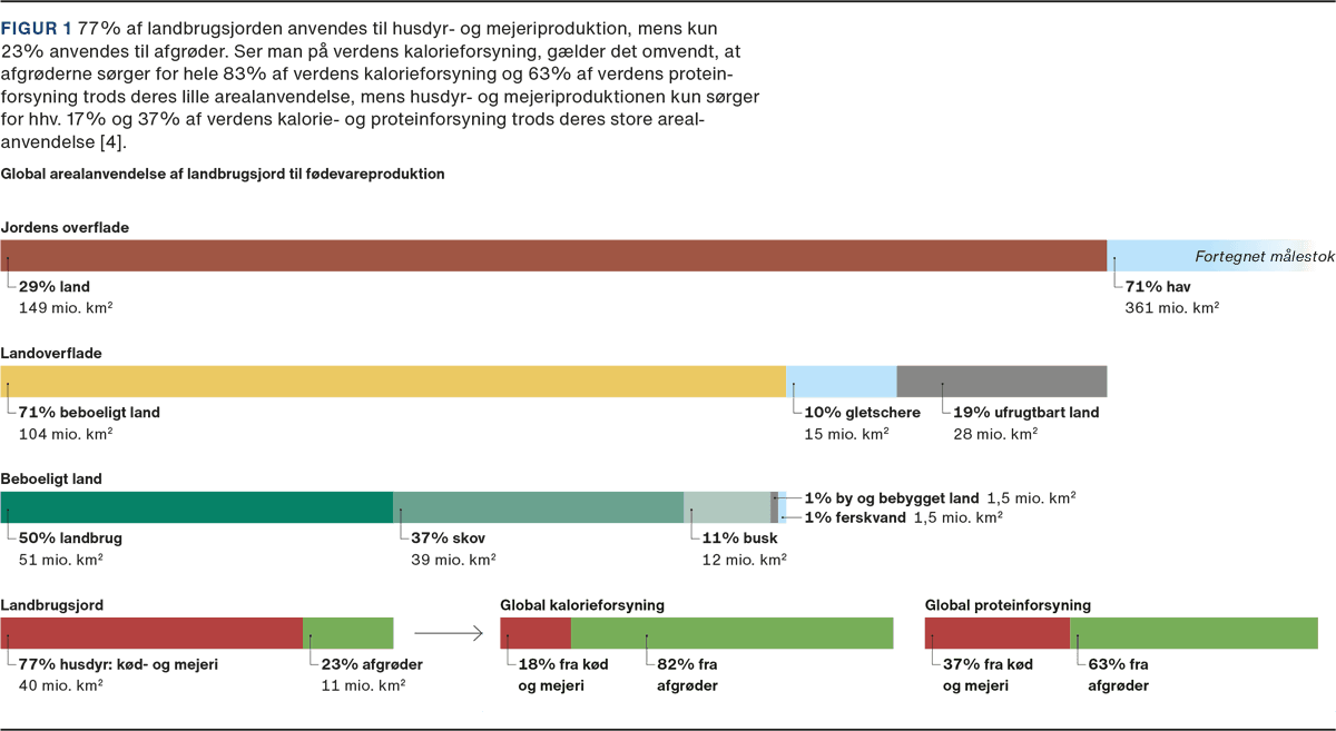 Ifølge FN’s fødevare- og landbrugsorganisation optager produktionen af husdyr og mejeri ca. 80% af landbrugsjorden globalt, men producerer mindre end 20% af jordens kalorier. Omvendt gælder det for produktionen af plantebaserede fødevarer (Figur 1). Data viser desuden, at hvis hele klodens befolkning spiste som en gennemsnitlig dansker, ville det kræve, at 136,1% af jordens beboelige areal blev til landbrug – dvs. selv hvis alt beboelig jord blev omdannet til landbrug, ville det stadig ikke kunne dække det globale kostbehov [4].
