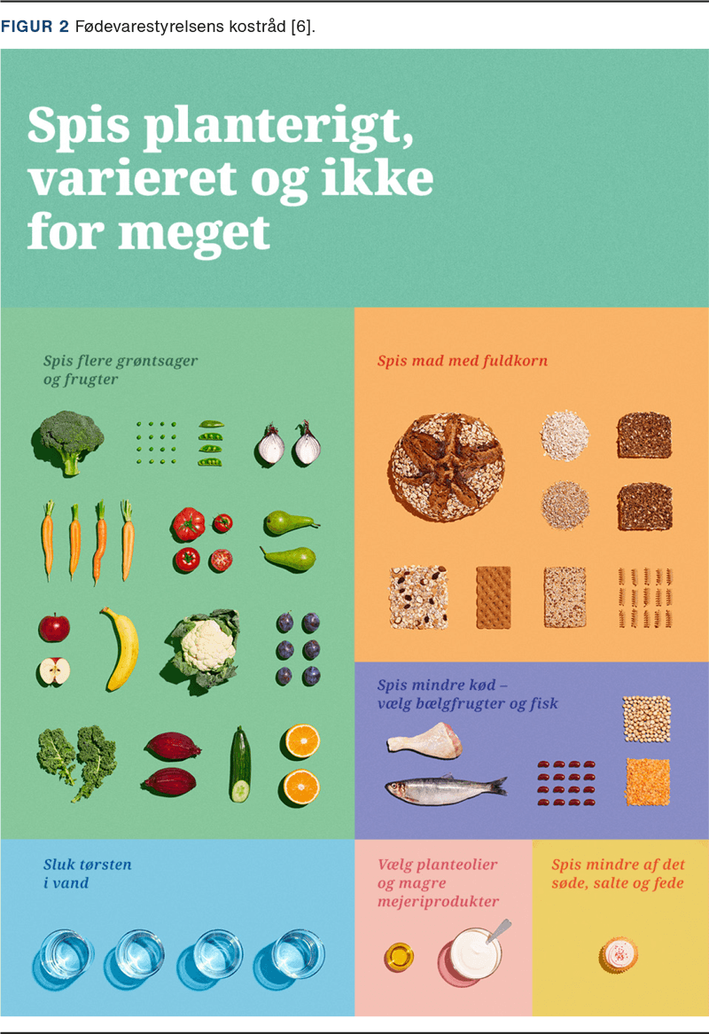 Når offentlige institutioner, f.eks. sundhedssektoren, skal udforme menu, gør de brug af Den Nationale Kosthåndbog [20], som er et opslagsværk, der indeholder retningslinjer for kost. Rådene hviler primært på De Nordiske Næringsstofanbefalinger, som er blevet opdateret i juni 2023 og nu er forenelige med DDK [21]. Når almenpraktiserende læger skal vejlede patienter om kost, findes der opslagsværker på DSAM begrænset til specifikke sygdomsgrupper, som tager udgangspunkt i DDK, MHK og Dietary Approaches to Stop Hypertension (DASH), og der er i nogle områder mulighed for henvisning til kommunale kostvejledningstilbud. Har patienten råd til det, kan man anbefale en diætist på egenbetaling. Der er ikke lavet studier, der undersøger, hvor meget og hvordan der snakkes om kost og ernæring under konsultationer i almen praksis, men en rapport fra Aarhus Universitet fra 2017 viser, at danskerne ligger helt i bund sammenlignet med fire andre europæiske lande, når det kommer til at spørge den praktiserende læge til råds om kost og ernæring [22]. Dette skyldes muligvis tidspres eller manglende viden på området, da undervisning i kost og ernæring på medicinstudiet er begrænset – til trods for, at der er solid evidens for, at kosten har afgørende betydning for sygdom og dødelighed.