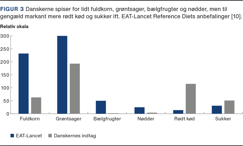 En gruppe forskere fra DTU Fødevareinstituttet sammenlignede danskernes kostvaner med EL. Resultaterne viste, at vi indtager hele otte gange mere rødt kød end anbefalet i EL. Vi spiser desuden væsentligt mindre fuldkorn, grøntsager, bælgfrugter og nødder end anbefalet, men derimod markant mere sukker (Figur 3) [11].