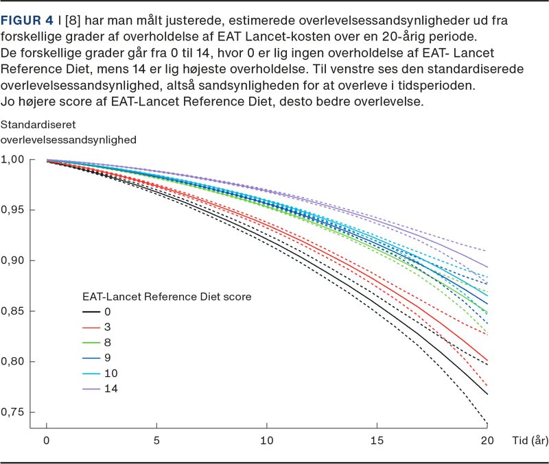 Den gavnlige effekt af en mere plantebaseret kost har været velkendt længe, især inden for bl.a. hjerte-kar-sygdomme, type 2-diabetes og kronisk nyresygdom. Her er der god evidens for middelhavskosten (MHK) [14, 15], som er en velundersøgt diæt, der indeholder en kost rig på frugt, grønt, bælgfrugter og fuldkorn samt nødder, frø og olivenolie som hovedkilder til fedt, et lavt-moderat indtag af fisk og fjerkræ og et lavt-moderat indtag af mejeriprodukter [14]. MHK læner sig således tæt op ad DDK og EL. MHK anses desuden for at være et af de mest bæredygtige kostmønstre, pga. det lave klimaaftryk i form af mindre drivhusgasudledning, brug af mindre landbrugsareal samt et mindre forbrug af energi og vand [14].