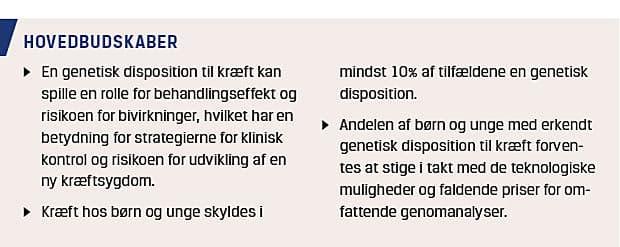 I 2015 foretog Pediatric Cancer Genome Projektet (PCGP) undersøgelser af 1.120 børn og unges genom og/eller exom (dvs. de proteinkodende regioner af genomet). Projektet viste, at andelen af kræfttilfælde, der skyldtes germ line-varianter, var højere end forventet (8,6%), at varianter i gener, der disponerer til kræft hos voksne, f.eks. BRCA2, også forekom med øget hyppighed blandt børn med kræft, og at en betydelig andel af børnene med kræft kan behøve en særlig behandlingstilrettelæggelse for at undgå alvorlige bivirkninger [20]. Siden har man i to større studier bekræftet, at genetisk disposition er ætiologisk forklarende hos ~ 10% af børn med kræft [21, 22]. Dog er alle tre studier behæftet med selektionsbias. F.eks. var patienter med binyrebarkkarcinom og lavhypodiploid-ALL (der ofte skyldes germ line-TP53-varianter) og patienter med sygdomstilbagefald eller behandlingsresistens overrepræsenterede i PCGP. Ydermere medførte manglende oplysninger om stamtræer og usikkerhed om arvegang en øget sandsynlighed for, at betydningsløse varianter blev klassificeret som patogene [20]. Endelig undersøgte man ikke strukturelle varianter (f.eks. deletioner), som udgør 15% af de patogene varianter ved kræftsyndromer [23]. Andelen af kræfttilfælde, der opstår hos børn og kan forklares ved germ line-varianter, herunder nyopståede varianter, er således fortsat usikker.