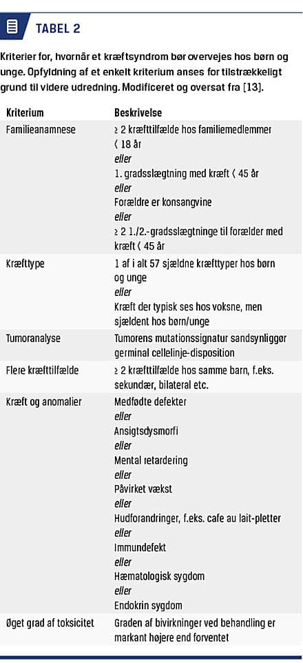 Siden opdagelsen af RB1-genet i 1989 er der beskrevet over 100 genetiske syndromer med øget forekomst af kræft hos børn og unge (Figur 1) [10]. Med de såkaldte Jongmans kriterier beskrives kliniske fund og kræfttilfælde i nærmeste familie, hvor der bør rejses mistanke om en underliggende genetisk disposition (Tabel 2). Iht. disse kriterier er genetisk udredning berettiget hos op til 30% af alle børn og unge med kræft [13, 14].