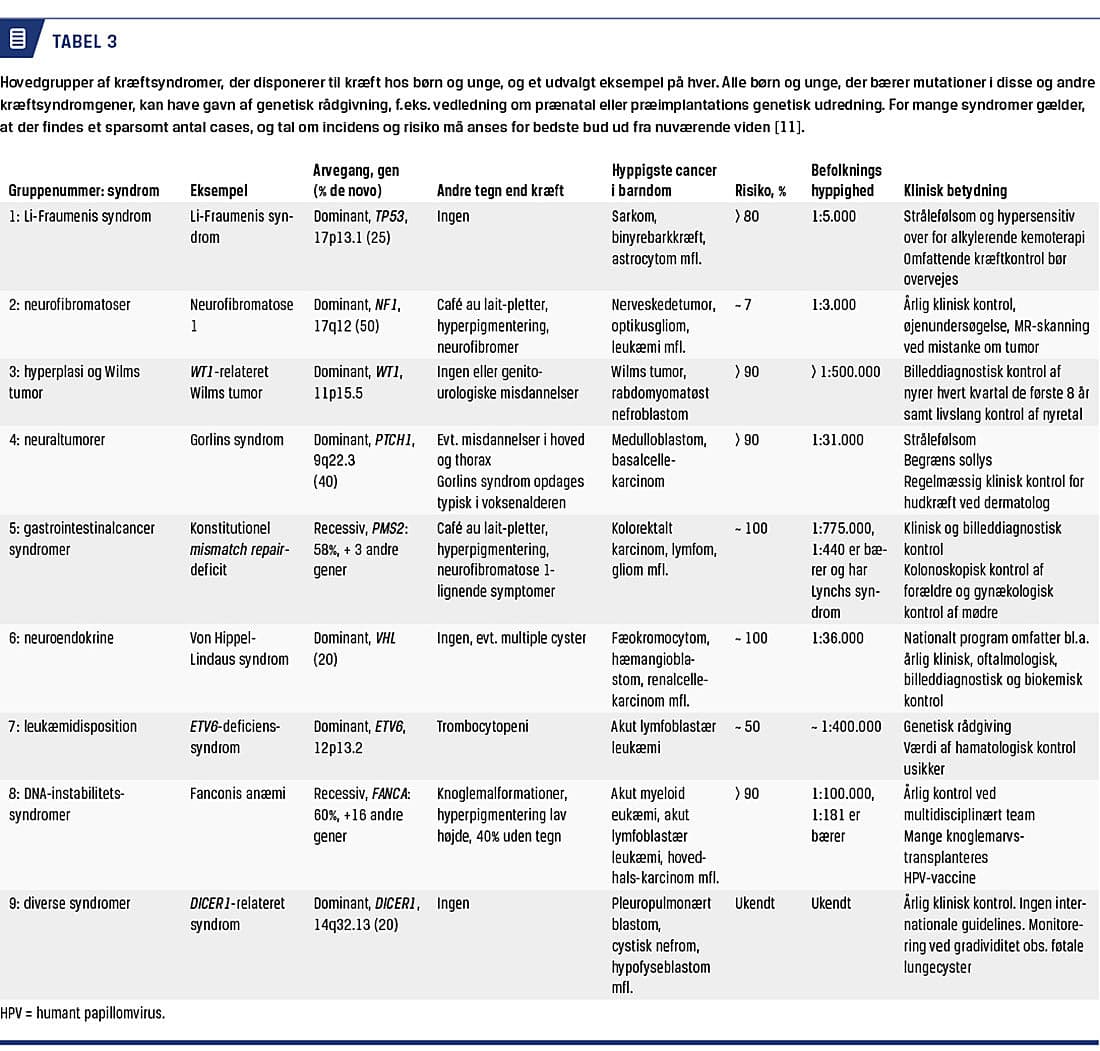 syndromer, 7) syndromer, der disponerer til leukæmi, 8) DNA-instabilitetssyndromer og 9) en heterogen gruppe af diverse andre syndromer (Tabel 3) [15].