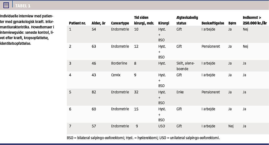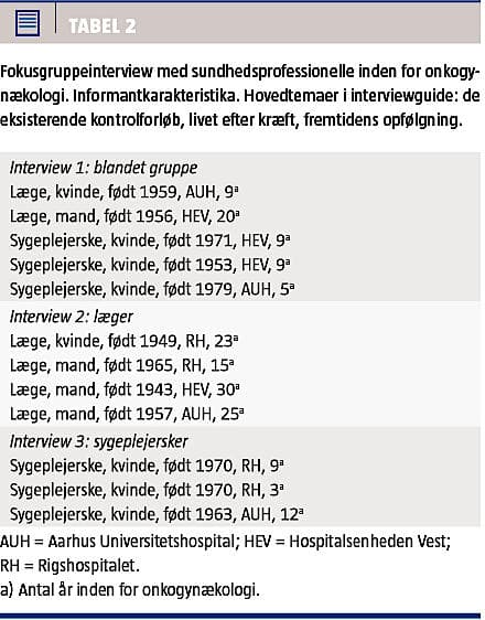 Der er foretaget semistrukturerede, individuelle interview med syv patienter med gynækologisk kræft (Tabel 1) og tre fokusgruppeinterview med seks speciallæger og seks sygeplejersker inden for onkogynækologien; der var repræsentation fra to ud af fem af de onkogynækologiske centre og et regionshospital (Tabel 2). Interviewguides blev udviklet på basis af observationer af 18 ambulante kontrolbesøg efter kræft foretaget i Gynækologisk Ambulatorium, Aarhus Universitetshospital. Informanterne til individuelle interview blev udvalgt blandt de gennemførte
