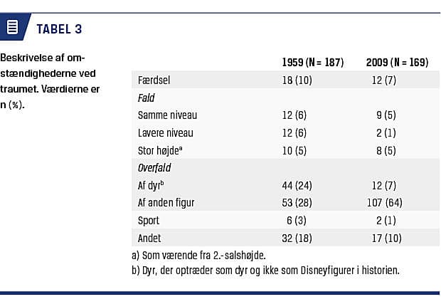 I Tabel 3 beskrives traumesituationen. Både antallet af færdselsulykker og faldulykker er reduceret i perioden. I 1959 var der signifikant flere dyreangreb (det vil sige dyr, der optræder som dyr og ikke som reelle Disneyfigurer i historien), hvorimod den interpersonelle vold fordobledes, idet antallet af overfald af en anden, navngiven, figur steg fra 53 til 107 i perioden.