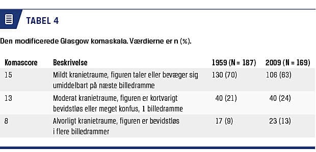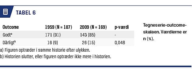 I 1959 var hovedparten af kranietraumerne (134 af 187, 72%) resultatet af en ulykke, hvilket er signifikant mere end i 2009, hvor det var 42% (p < 0,001). Sværhedsgraden af traumerne beskrevet ved GCS og TCS var uændret i perioden (Tabel 4 og Tabel 5), hvorimod der netop er signifikant forskel på outcome, idet figurerne i 2009 havde et dårligere outcome (p = 0,048) (Tabel 6). Om sidstnævnte er et reelt fund eller et udtryk for, hvornår kranietraumerne forekommer i historien (der kan have været flere situationer, hvor historien endte med traumet), er ikke muligt at verificere.