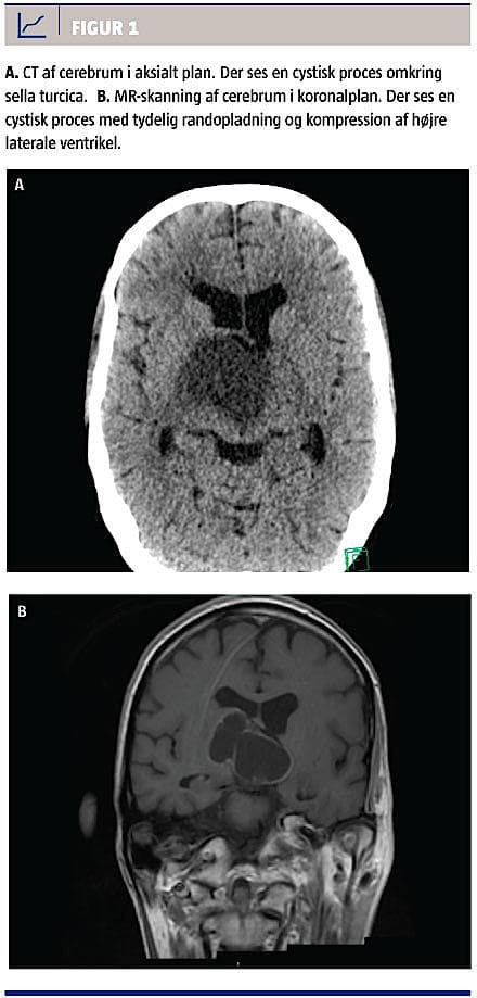 efter genopvarmning, blev der foretaget CT af cerebrum. CT’en viste en 3 × 4 × 6 cm stor central cystisk tumorproces med randopladning (Figur 1). Han fik stigende bevidsthedsniveau og blev med en Glasgow Coma Score på 14 overflyttet til en neurointensiv afdeling. Her blev der fundet endokrinologisk derangering af alle akser og svært nedsat syn. Tumoren blev herefter excideret succesfuldt, men i efterforløbet opstod der et intracerebralt hæmatom og hydrocephalus, EEG’et var abnormt, og der var betydelige iskæmiske forandringer i hjerneparenkymet. I samråd med familien afsluttedes den aktive behandling, og patienten afgik ved døden samme dag.