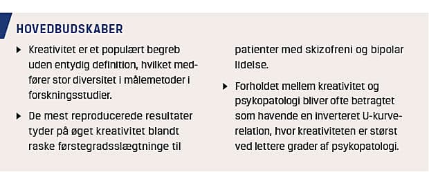 Forbindelsen mellem kreativitet og psykisk lidelse har længe interesseret både videnskaben og samfundet generelt. Fænomenet kan spores tilbage til flere kulturer, hvor det var et karakteristisk træk ved individer som vismanden eller geniet [1, 2]. Aristoteles er citeret for at have sagt »No great genius has ever existed without some touch of madness« [3], og personer som den hollandske maler Vincent van Gogh, den tyske digter Friedrich Hölderlin og den amerikanske matematiker John Nash bærer vidnesbyrd om denne såkaldte mad genius-hypotese. Den tilsyneladende paradoksale sammenhæng er velkendt fra fiktion og medier, men danner også udgangspunkt for en bred vifte af empiriske undersøgelser.