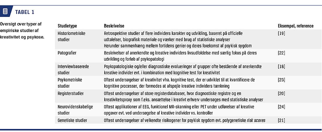 Formålet med denne artikel er at skitsere nogle centrale historiske og konceptuelle aspekter af forbindelsen mellem kreativitet og psykose samt at give et overblik over forskellige typer metoder, som er anvendt i empiriske studier af fænomenet. Særligt sammenhængen mellem skizofreni og kreativitet har vores interesse, da den kan bidrage til en øget forståelse af skizofreni.