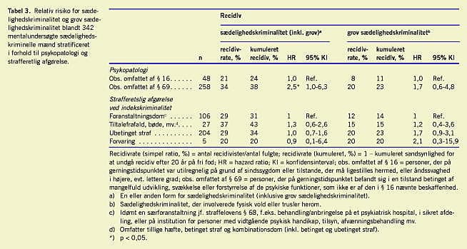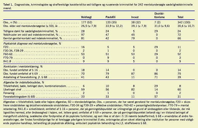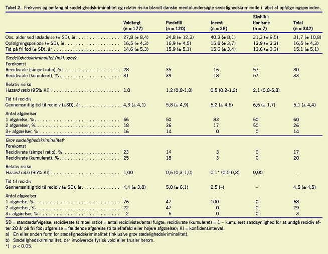 Resultater: Af den fulgte kohorte (n = 342) blev 30% dømt for sædelighedskriminalitet (inkl. grov sædelighedskriminalitet), 17% for grov sædelighedskriminalitet, 32% for nonseksuel vold og 61% for generel kriminalitet i opfølgningsperioden (gennemsnitlig 16,5 år). Der var lav forekomst af gentagne tilbagefald til sædelighedskriminalitet (12%) og til grov sædelighedskriminalitet (6%). Pædofile og ekshibitionister havde størst risiko for sædelighedskriminalitet og gentagne tilbagefald. Voldtægtsforbrydere havde størst risiko for at begå grov sædelighedskriminalitet og recidiverede hurtigere end de øvrige grupper gjorde. Incestkrænkere recidiverede med lav frekvens. Svært psykisk syge og retarderede havde signifikant lavere risiko for sædelighedskriminalitet end mindre forstyrrede.