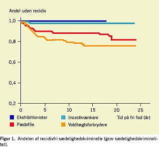 I overensstemmelse med udenlandske resultater viste materialet, at visse grupper af sædelighedskriminelle har forhøjet risiko for recidiv. Således var der en relativ højere forekomst af seksuelt recidiv blandt ekshibitionister og en relativ lavere recidivrate blandt incestkrænkere, mens recidivet for pædofile og voldtægtsforbrydere lå herimellem [8-9, 12-13]. Der-imod blev der i modsætning til flere tidligere undersøgelser ikke registreret højere recidiv blandt homoseksuelt krænkende pædofile [8, 13].