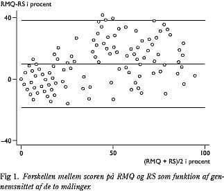 Differenserne mellem RMQ og RS samt mellem RMQ og PF er normalfordelte. I begge sammenligninger er mere end 95% af målingerne placeret inden for 95% limits of agreement (Fig. 2 ). Begge differensplot er på et nogenlunde konstant niveau, men der ses en meget svag stigning fra de lave værdier til de højere værdier. Dette sammenholdt med at den gennemsnitlige differens er ca. ti procentpoint (RMQ-RS = 9,9 procentpoint og RMQ-PF = 11,6 procentpoint), hvilket vil sige, at når scoreintervallerne er omformateret til en 0-100 skala, ligger en patients score gennemsnitlig ti procentpoint højere på RMQ end på RS og PF (SF-36). Der er en acceptabel homogen varians.
