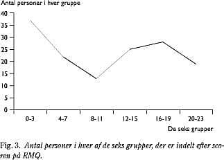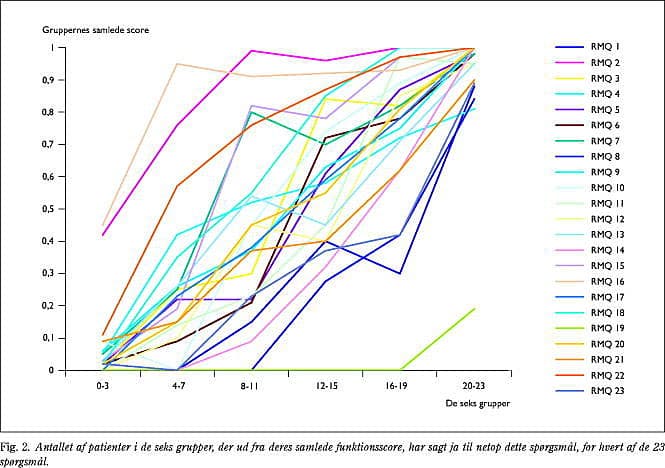 Sammenlignes de 23 kurver (Fig. 2), ser man, at generelt stiger alle jævnt med højere total score, ingen er helt flade på en bestemt værdi, og ingen har modsat hældning. Dette er et udtryk for, at alle spørgsmål i RMQ vedrører den samme underliggende variabel. Enkelte kurver varierer fra der jævnt stigende mønster, hvor spørgsmål nr. 2 + 16 og 19 er de tre ekstremer. Hvor der ikke skal meget funktionshæmning til, at patienten svarer ja på spørgsmål 2 og 16, så skal patienten være næsten totalt invalideret, før end der svares ja på spørgsmål 19. Dette diskvalificerer ikke de nævnte spørgsmål, men er netop RMQ's styrke, at den spænder meget vidt og er positiv ved selv en meget begrænset funktionspåvirkning og først udtrykker en topscore, når patienten er ekstrem dårlig.