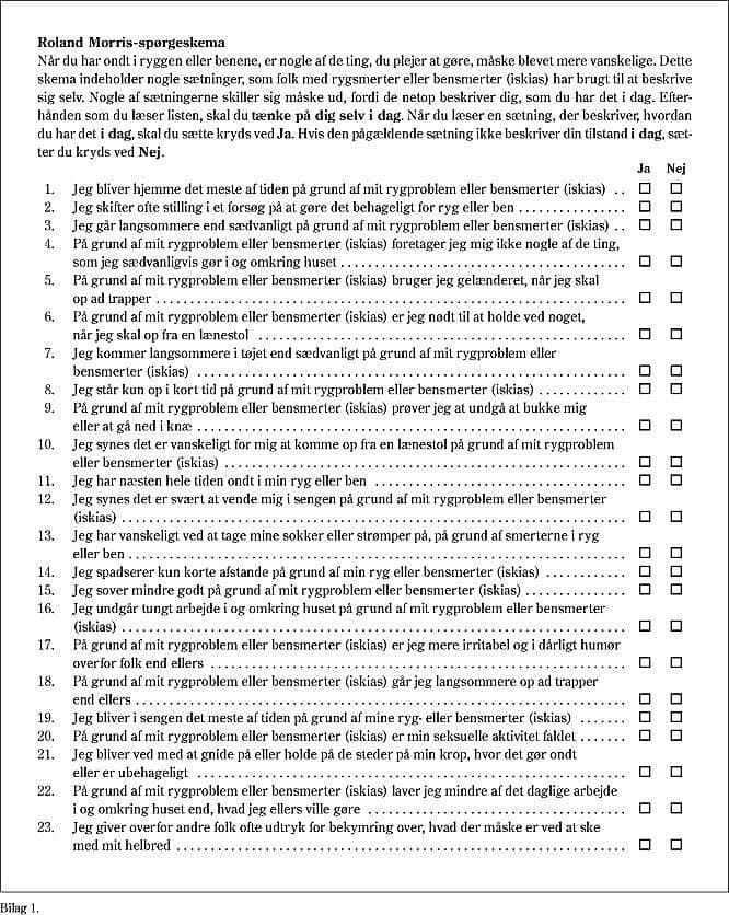 RMQ blev oprindelig udviklet i 1982 af Martin Roland og Richard Morris (6). I 1995 blev skemaet modificeret således, at også patienter med iskiassmerter blev omfattet af spørgsmålene. I denne undersøgelse blev der anvendt den modificerede udgave, der består af 23 udsagn (Bilag 1 ). Hvert spørgsmål kan besvares med ja eller nej, alt efter om udsagnet passer på patienten. Hvert ja-svar giver 1 point, og skalaen går derfor fra 0 til 23, hvor 0 er ingen funktionsnedsættelse og 23 er voldsom reduktion af funktionsniveauet. Formålet med undersøgelsen var at foretage en konvergent kriterievalidering af en dansk oversættelse af RMQ i forhold til Low Back Pain Rating Scale og fysisk funktionsskalaen fra SF-36.