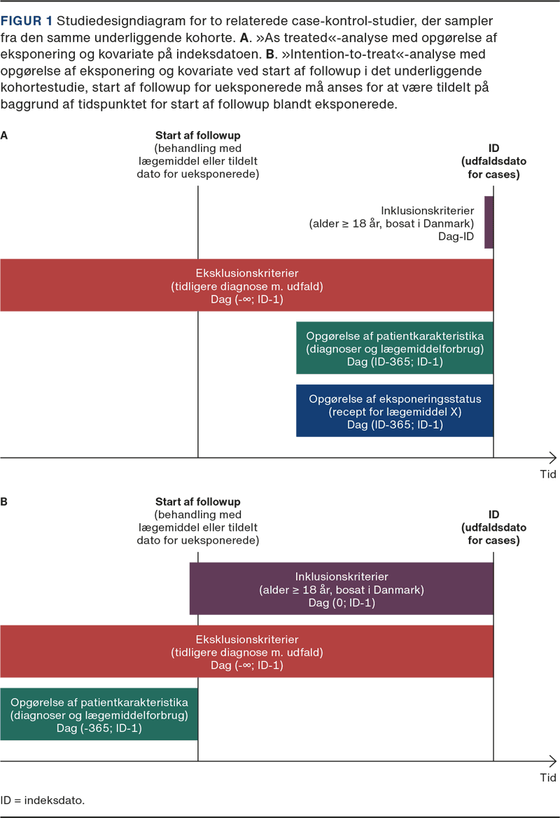 I et kohortestudie opgøres eksponeringen ved begyndelsen af followup. I et case-kontrol-studie derimod har man to muligheder enten ved begyndelsen af followup i det (fiktive) underliggende kohortestudie eller på indeksdatoen. Vælges førstnævnte, forebygger man tidsrelateret bias [15]. Det er ikke forkert at opgøre eksponering på indeksdatoen, men man skal være opmærksom på, hvilken slags effekt der undersøges: I et kohortestudie ville denne analysemodalitet svare til, at personer kan skifte eksponeringsstatus i løbet af followup og bidrage persontid til begge kohorter. Dette svarer til en as-treated-analyse af et randomiseret forsøg [16] (Figur 1).
