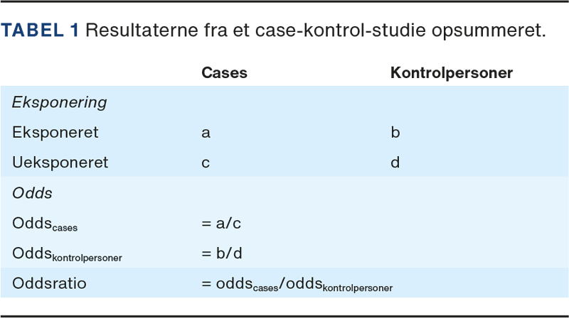 Strukturen i et case-kontrol-studie er vist i Tabel 1, og terminologien herfor er forklaret i Tabel 2. Den primære sammenligning er forekomsten af eksponering blandt cases og kontrolpersoner. Hyppigst anvendes en oddsratio til opsummering af denne sammenligning. Oddsratioen beregnes som odds for eksponering blandt cases divideret med odds for eksponering blandt kontrolpersoner og kan tolkes som andre relative effektestimater. Hvis kontrolpersoner er udtrukket ved en form for density sampling, er denne oddsratio et estimat af incidensrateratioen fra det underliggende kohortestudie.