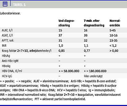 Pigen blev passet i børnehave og havde adspurgt ingen gener. Hun fremstod upåvirket, og en objektiv undersøgelse viste normale forhold. Der fandtes højsmitsom HBV-infektion uden aktuel leverpåvirkning, hvilket var uændret ved opfølgning i børnehepatologisk ambulatorium syv måneder senere (Tabel 1 ). Der fandtes ikke indikation for påbegyndelse af behandling, men der blev tilbudt løbende opfølgning.