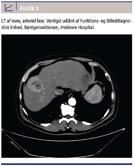 ferase (ALAT)-niveauet var 153 E/l (normalt 10-70 E/l) på henvisningstidspunktet. På grund af den forhøjede AFP-koncentration blev patienten henvist til trefaset CT af abdomen, hvorved man fandt tre malignitetssuspekte processer, der var forenelige med HCC (Figur 1).