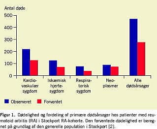 Patienter med RA har øget dødelighed sammenlignet med den generelle befolkning med en standardiseret mortalitetsratio på op til 3 og nedsættelse af middellevetiden på 3-18 år [1]. Overdødeligheden ved RA er primært kardiovaskulært betinget, idet der ved sammenligning af RA-patienter med artrosepatienter og raske (Figur 1 ) findes en øget forekomst af akut myokardieinfarkt (AMI), hjerteinsufficiens og cerebralt infarkt [2, 3]. Patienter med RA har 3-4 gange større risiko for kardiovaskulære hændelser end aldersmatchende kontrolpersoner [4].