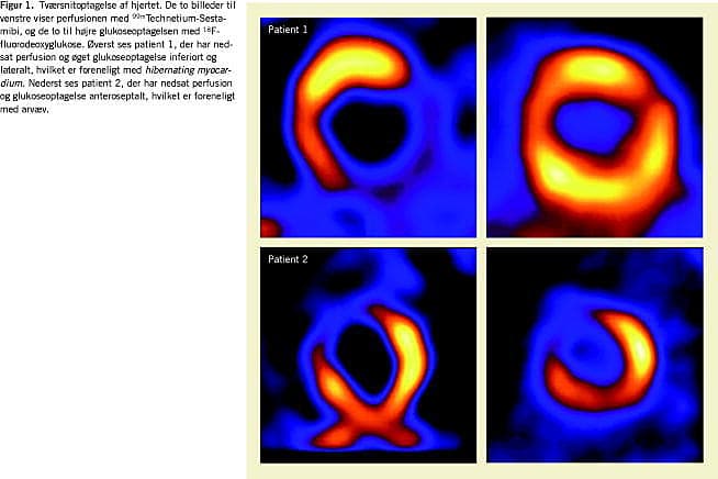 Mellem 50.000 og 100.000 danskere lider af hjerteinsufficiens. Hos ca. 60% er ætiologien iskæmisk hjertesygdom [1]. Hjerte-insufficiens er kendetegnet ved nedsat funktionsniveau, forringet livskvalitet og betydelig reduceret restlevetid. Det er veldokumenteret, at prognosen afhænger af graden af reduktion i venstre ventrikels uddrivningsfraktion (EF) [2, 3]. EF er dog ikke altid irreversibelt nedsat, idet hjertemusklen kan bedre pumpefunktionen efter et revaskulariserende indgreb. Det skyldes, at dysfungerende områder i hjertet hos nogle patienter er reversibelt dysfungerende, dvs. at den kontraktile funktion forbedres, når gennemblødningen normaliseres efter perkutan koronar intervention (PCI) eller koronar bypasskirurgi (CABG) [4]. Disse områder benævnes hibernating myocardium (HIB) (myokardium i dvale) [5] og er karakteriseret ved nedsat blodforsyning og ændret metabolisme i form af overvejende forbrænding af glukose mod frie fede syrer i normalt myokardium [6].