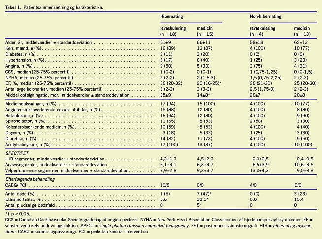 Materialer og metoder: I løbet af en toårsperiode blev 51 patienter henvist til undersøgelse for HIB. Hjertets gennemblødning og glukoseoptagelse blev vurderet med 99m Tc-sestamibi single photon emission computed tomography (SPECT) og 18 F-fluorodeoxyglu-kose ( 18 F-FDG) gammakamera-positronemissionstomografi (PET). Områder med HIB blev defineret ved at have nedsat gennemblødning, men bevaret FDG-optagelse. Journaler, dødsattester og Det Centrale Personregister blev gennemgået retrospektivt.