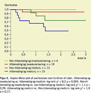 Resultater: Der indgik 50 patienter i undersøgelsen. Blandt patienter med HIB var overlevelsen signifikant bedre hos de revaskulariserede end hos de medicinsk behandlede patienter (etårsmortalitet: 6% vs. 33%, p = 0,004). Patienter, der havde HIB og ikke blev revaskulariserede, havde en øget risiko for pludselig død (fem ud af 15 patienter vs. ingen ud af 35 patienter p = 0,003).