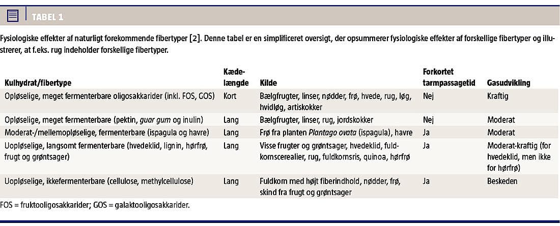 tilstedeværelsen af cellulose, hemicellulose, pektin, gums, resistent stivelse og lignin. Kostfibre kan inddeles i: 1) vandopløselige, viskøse, 2) vandopløselige, nonviskøse og 3) vanduopløselige fibre (Tabel 1). Kostfibre kan desuden opdeles i kort- og langkædede samt efter deres evne til fermentering. Ingen fødevarer undtagen fibertilskud indeholder »rene« fibertyper. I rugbrød indgår der for eksempel både opløselige og uopløselige fibre [1-3].