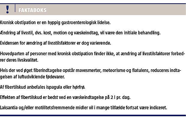Hovedparten af patienterne med kronisk obstipation finder ikke, at ændring af livsstilsfaktorer forbedrer deres livskvalitet [30], hvorfor laksantia og/eller motilitetsfremmende midler i mange tilfælde fortsat vil være indiceret.